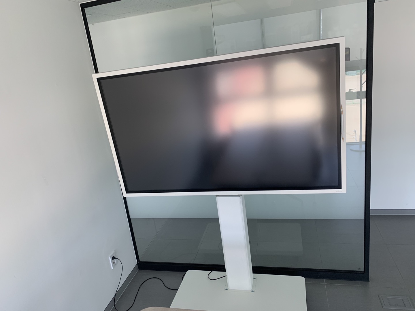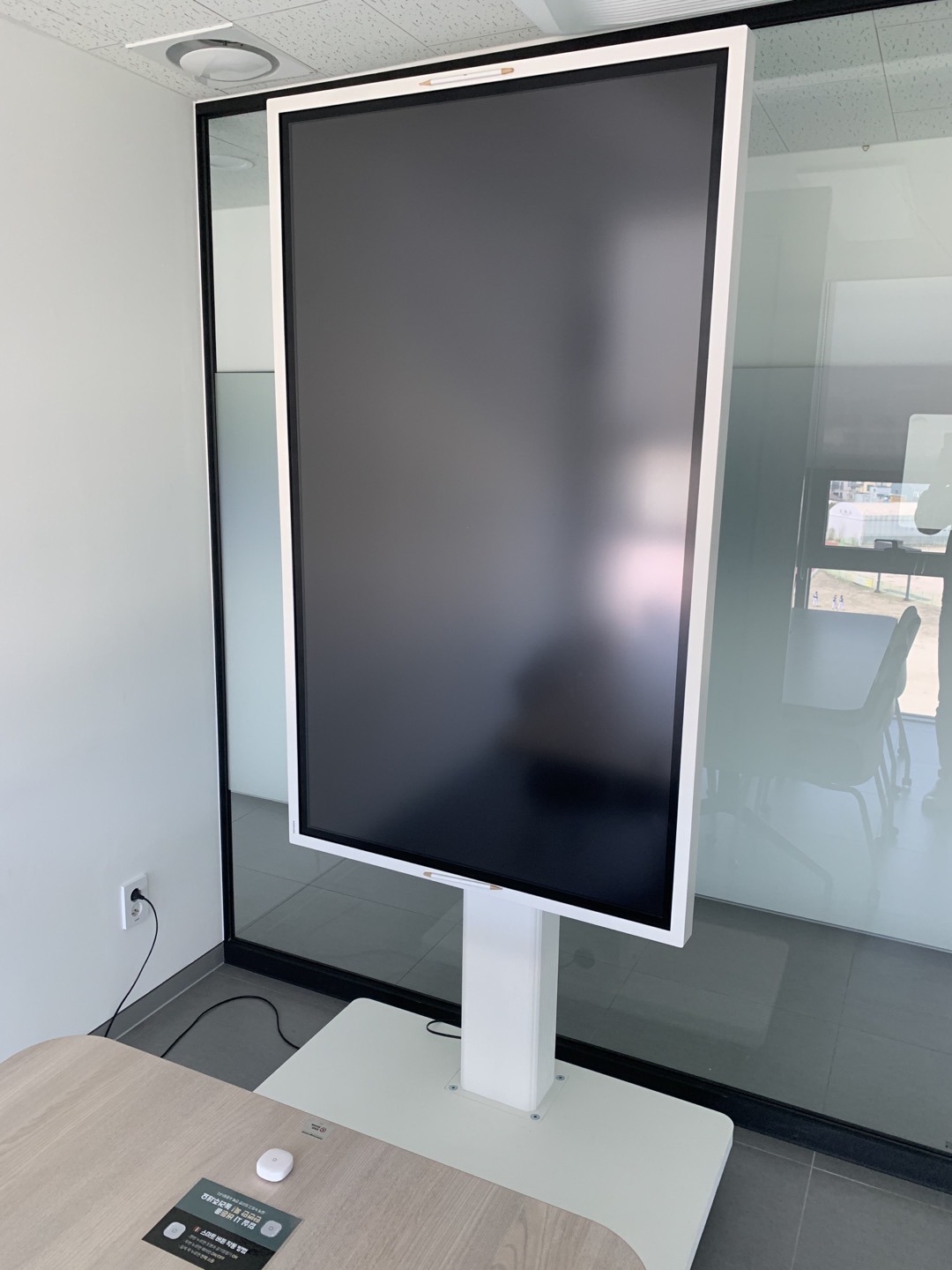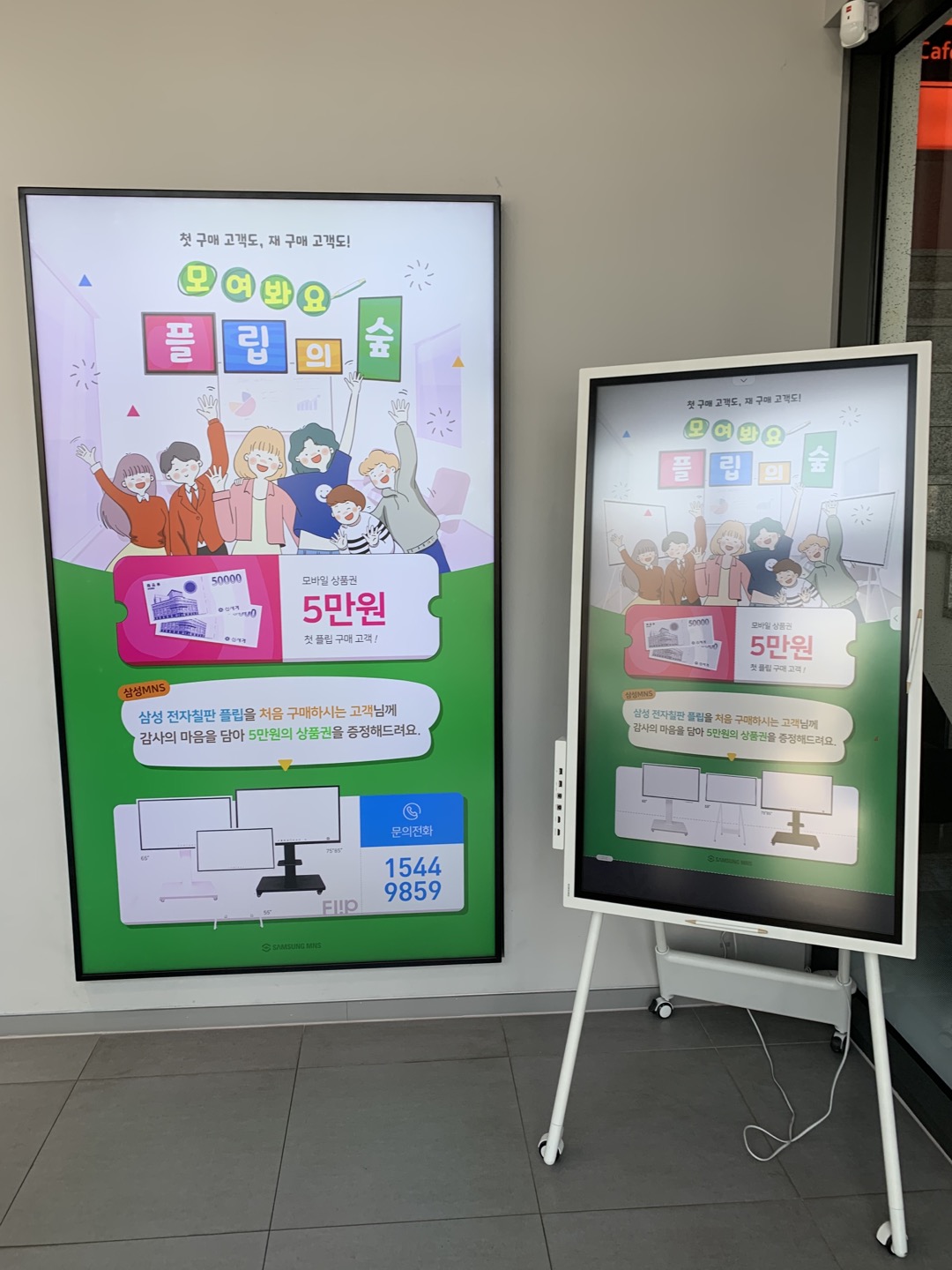 98인치 사이니지 옆에 플립2 55인치 기본 스탠드 형 제품을 세로 형으로 전환해서 세워 놓은 모습입니다.
