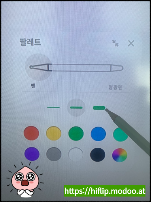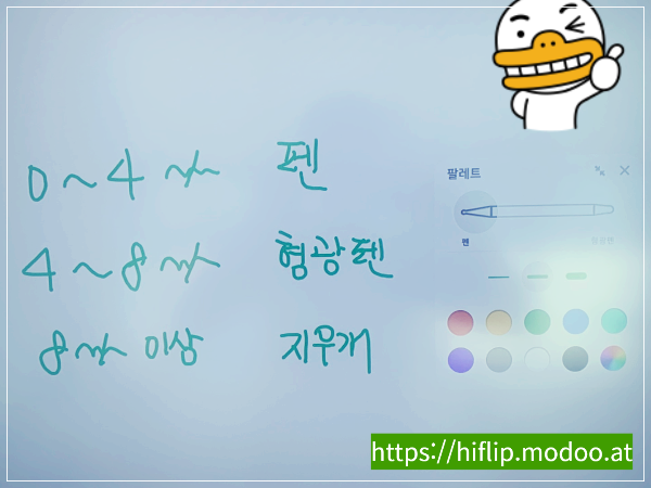 전자칠판 바탕 화면에 사용 하고자 하는 모드를 2초 정도 꾸~욱 누르고 있으면 색상 과 굵기의 변환이 가능한