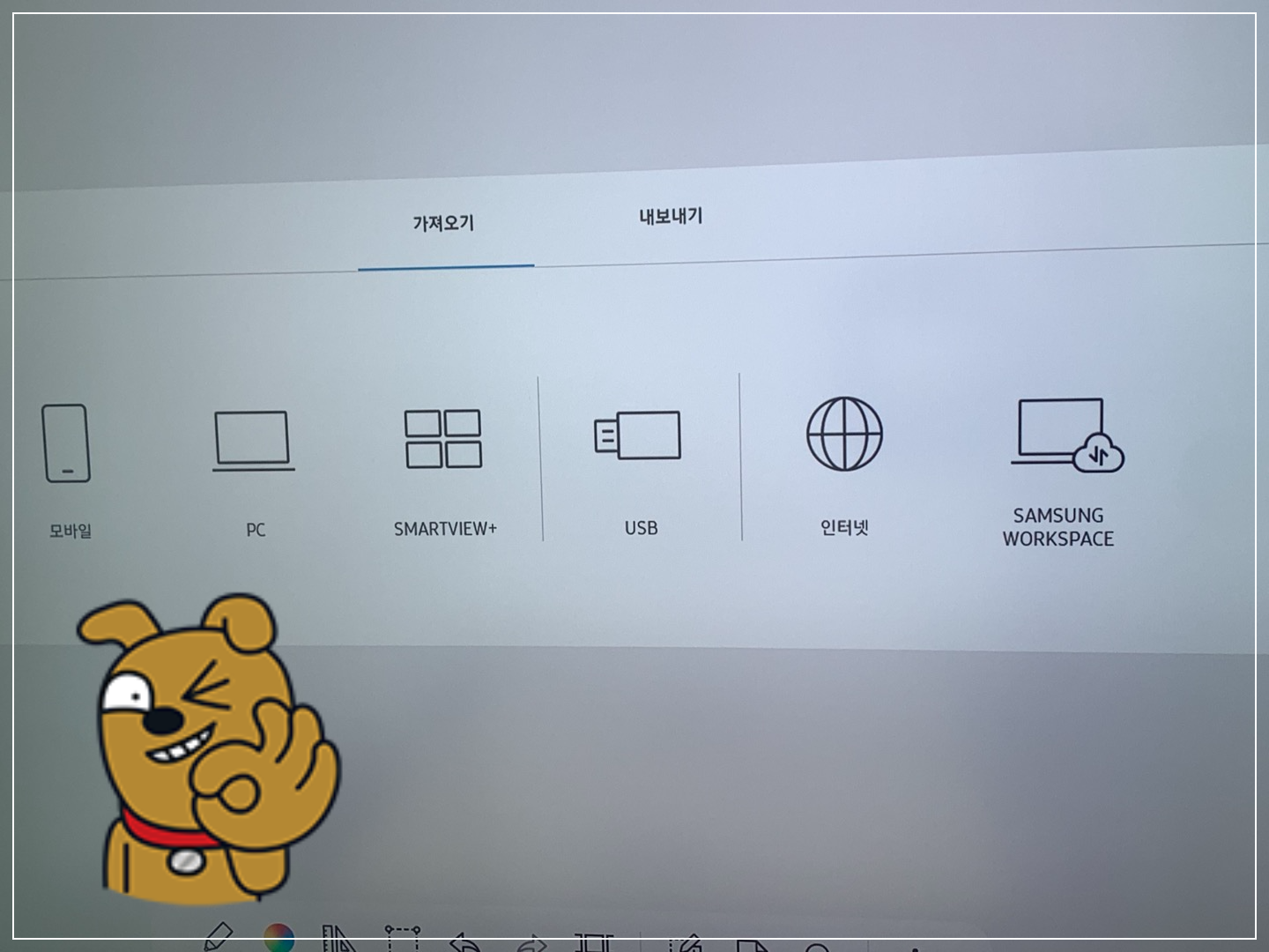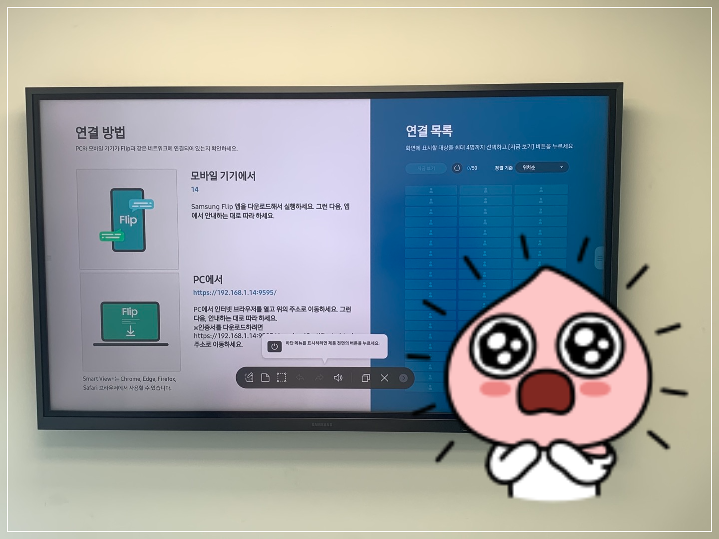 삼성 전자칠판에서는 노트북과 태블릿 그리고 휴대폰을 이용한 무선 미러링 기능이 있다는 것은
